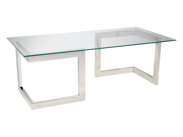 Contemporary rectangular glass cocktail table with chrome base. Available in Black Base. Size = Length 50", Depth 22" , Height: 16".