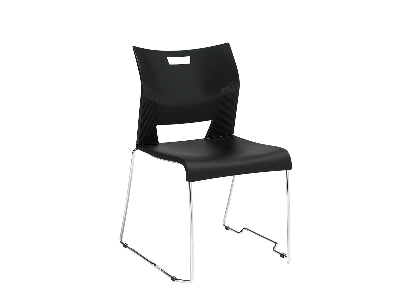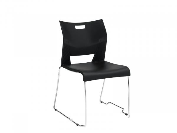 Comfortable black plastic chair with chrome ganging frame can be used individually or in large quantities for theater or classroom seating. Dims: 21" L, 23" D, 33" H