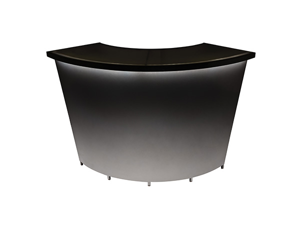 CEBR-002 Midtown Bar with Lights -- Trade Show Rental FurnitureCurved Midtown Bar with Lights and Plug-in. Pewter Color. Dims: 60" L x 18" D x 42" H