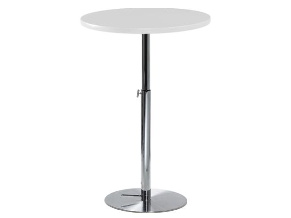 CEBT-014 | 30" Round Bar Table w/ White Top and  Hydraulic Base -- Trade Show Furniture RentalUnique 30" round bar table in various tabletop colors with a brushed steel hydraulic base. Dims: 30" R, 45" H