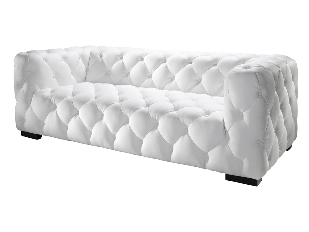 This upscale tufted white vinyl sofa with a modern flair is compact, comfortable and stylish. Dims: 87.5" L x 40.5" D x 30" H