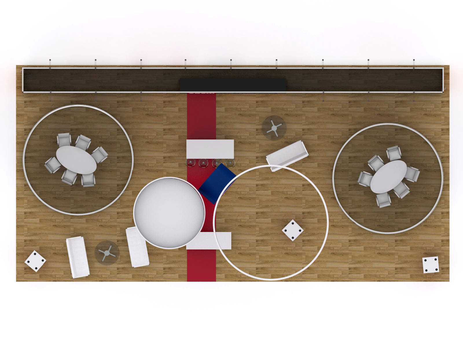 The 60 ft islands include two meeting rooms and the 40 ft. has one. The meeting rooms are built with Gravitee, just like the backwall, with the same tool-less assembly. Bothdesigns include Aero Overhead Hanging Signs for maximum exposure throughout the exhibit hall. In addition, there are two "bar" counters with open backs and shelves and podiums with storage and wireless charging pads.
