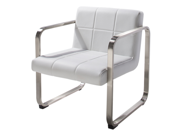 Modern club chair with brushed metal frame and dark brown or white vinyl complements modern or rustic seating vignettes. Can also be used alone as a stage chair or for meetings. Dimensions: 27"L 26"D 30"H