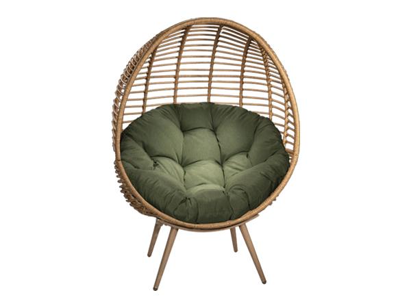 Aruba Lounge ChairDistinct indoor/outdoor papasan-style chair with a fern green cushion or charcoal cushion, wood-look metal frame and resin rattan. Dims: 42"L x 43.5"D x 59.75"H