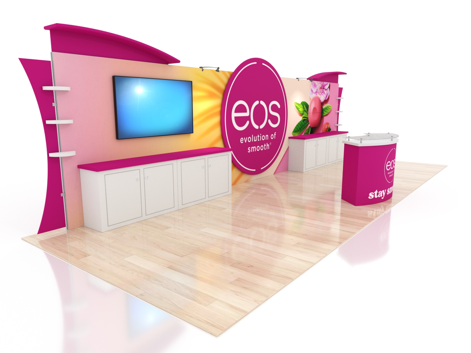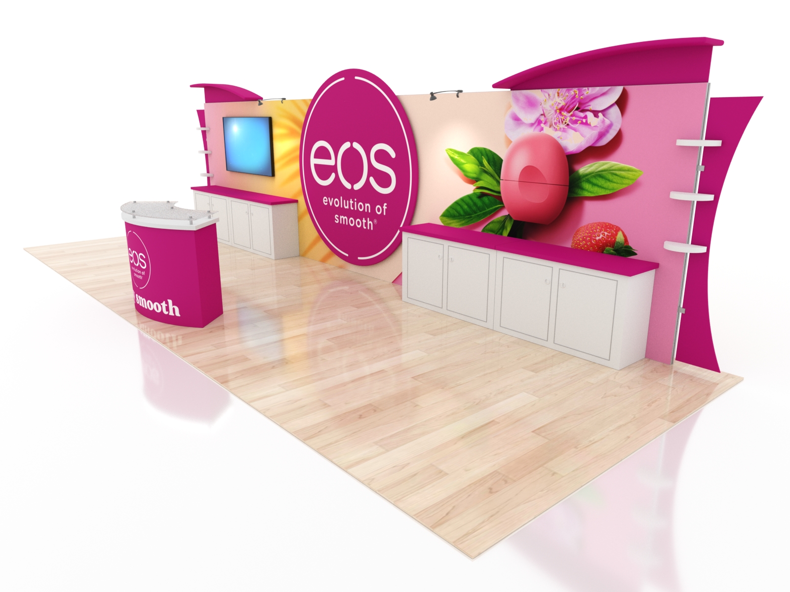 These designs come with ample storage in cabinets on the backwall and in the curved reception counter. Add vinyl graphics to both for more branding. The entire display packs in a fabric-lined, fully jigged custom crate. Each component is numbered for effortless assembly.