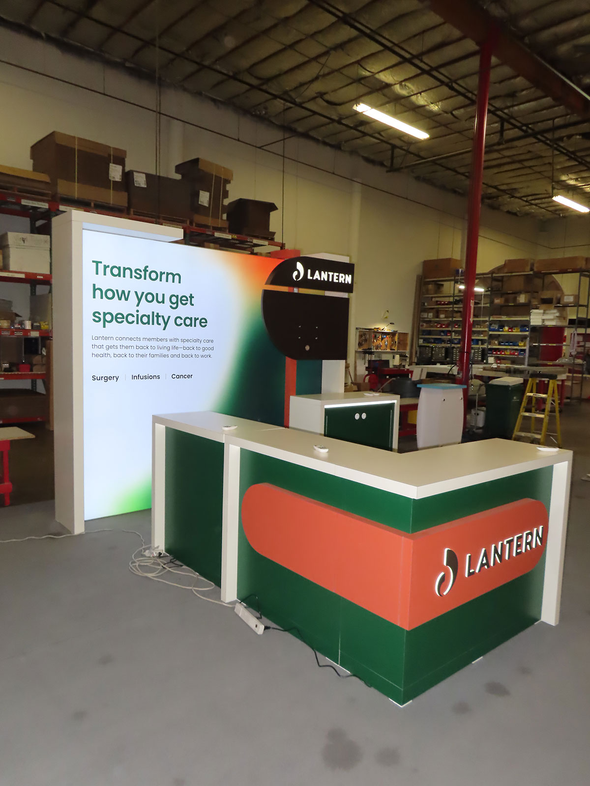 Reception Counter with Backlit Graphics, Wireless Charging Pads,