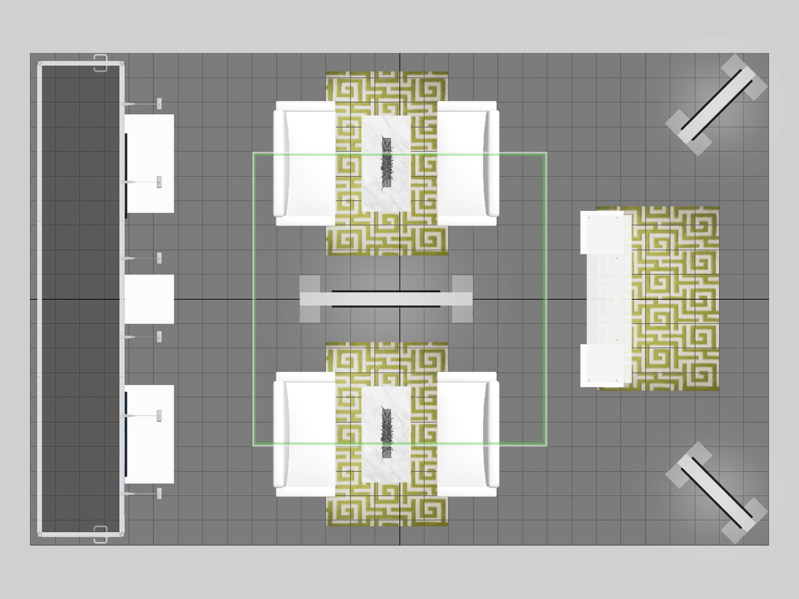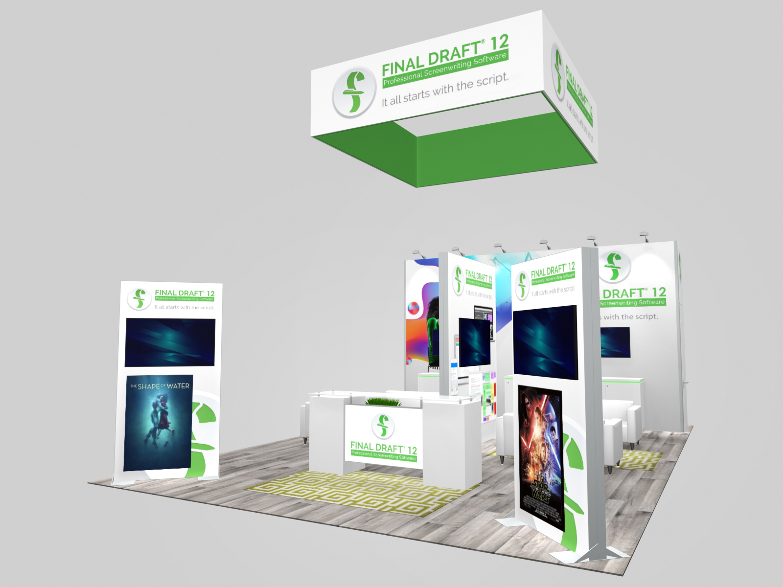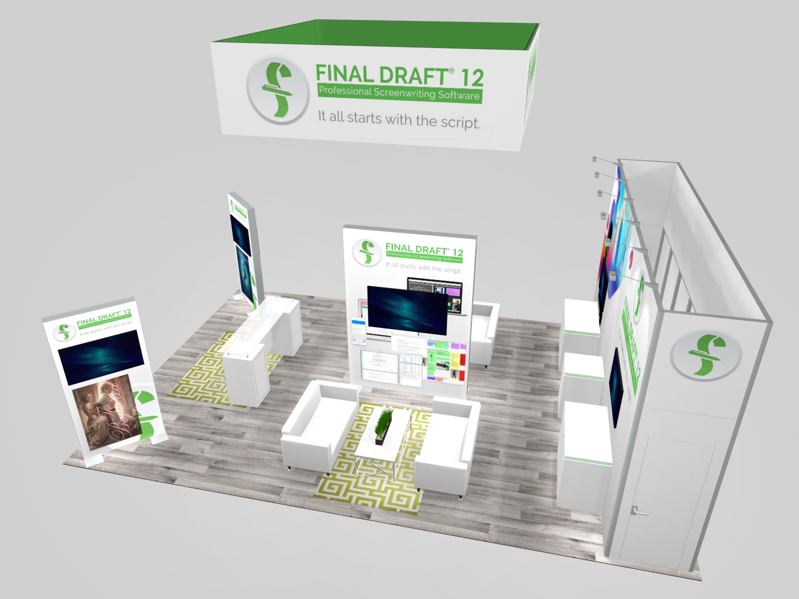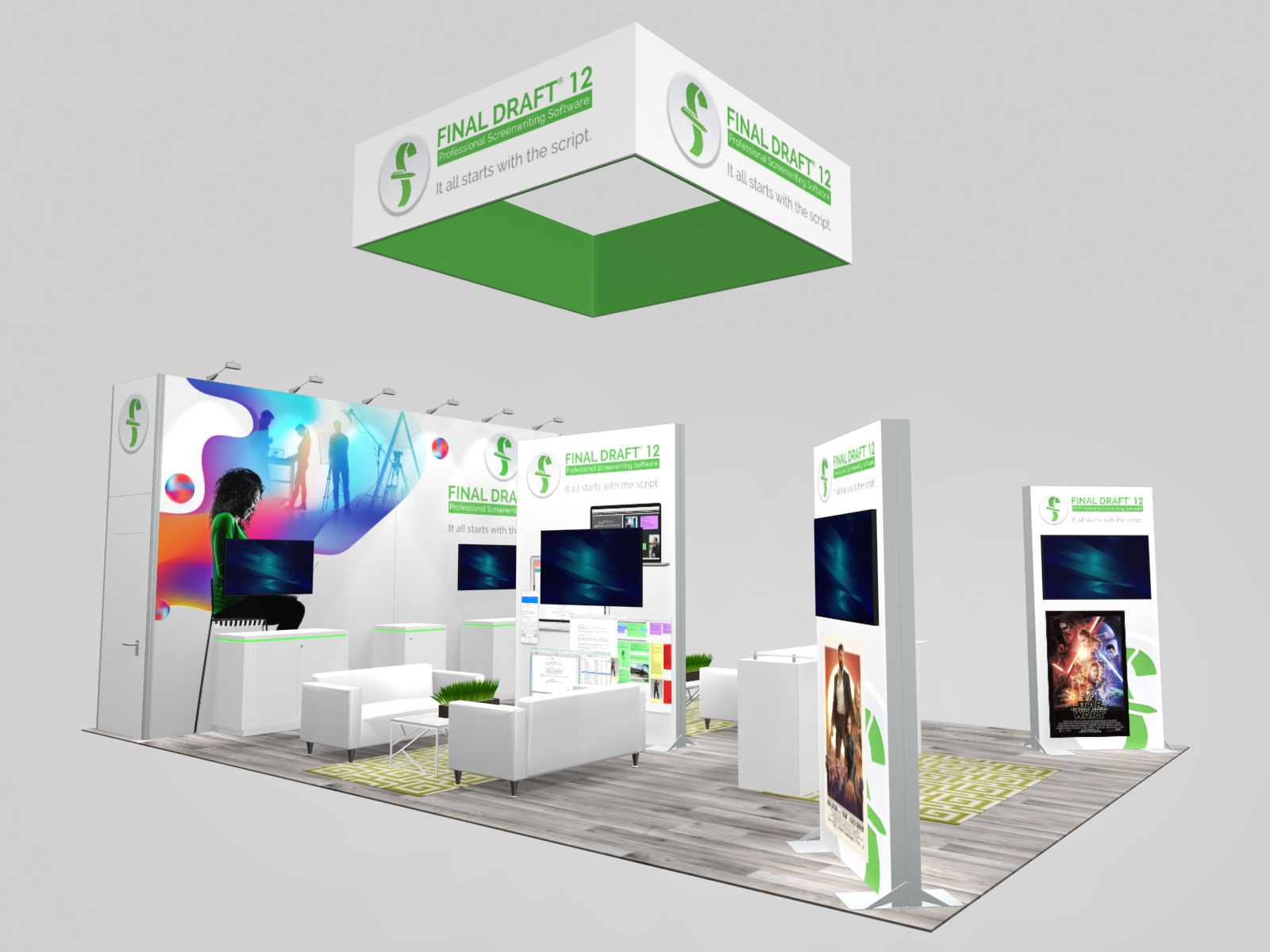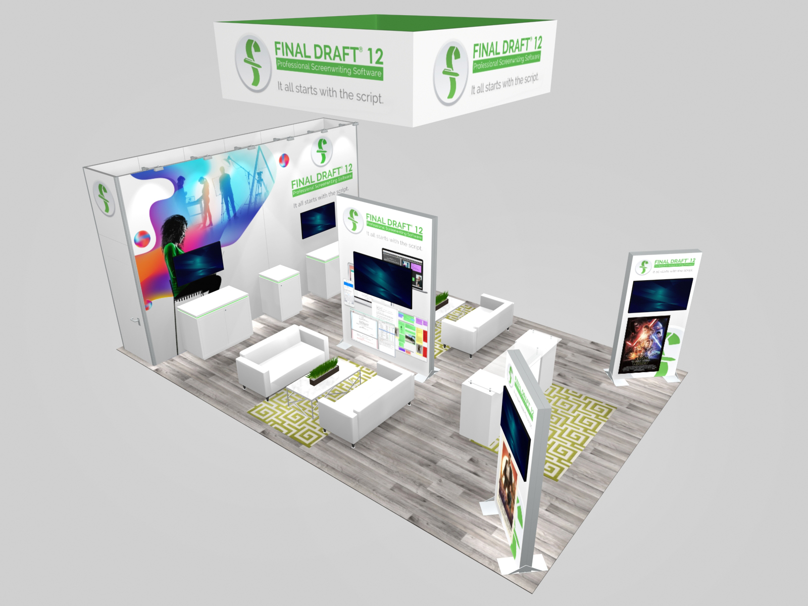 The backwall serves three purposes. There are counters and monitors for client consultations. Large direct print graphics for messaging, and a 20 ft. long closet for storage. And for maximum visibility on the show floor, the booth includes an overhead square hanging sign.