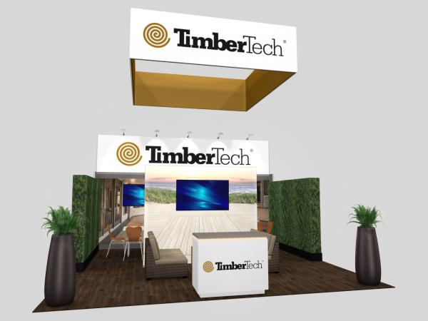 Every great exhibit design starts with your trade show objectives. Seems simple. Yet, many exhibitors ignore features that would maximize their objectives... meeting space for example. The RE-9159, 9160, and 9161 islands are perfect for companies committed to spending quality time with existing or potential clients. They include casual and semi-formal meeting spaces, surrounded by large format graphics, large monitors, reception counter, and and even backlighting. The greenery dividers and accent pieces add a friendly, welcoming vibe while serving as convenient privacy dividers. There's even a large overhead hanging sign announcing your presence throughout the show hall.