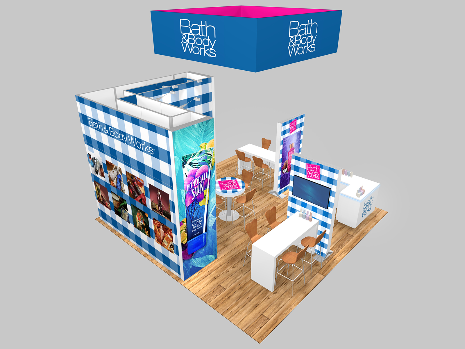 Visually, the design has (2) single-sided LED lightboxes and (2) double-sided lightboxes and large format fabric graphics along the back and front of the tower. For maximum visibility in the show halls, there’s a large square hanging sign with a graphic ceiling. The reception counter has LED accent lights and locking storage.